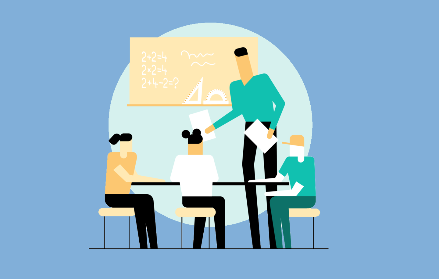Illustrasjon av en dame som balanserer på en fot i midten av en stor sirkel. Rundt er det små dekorative ting, og en "pulslinje" som går i bølger.